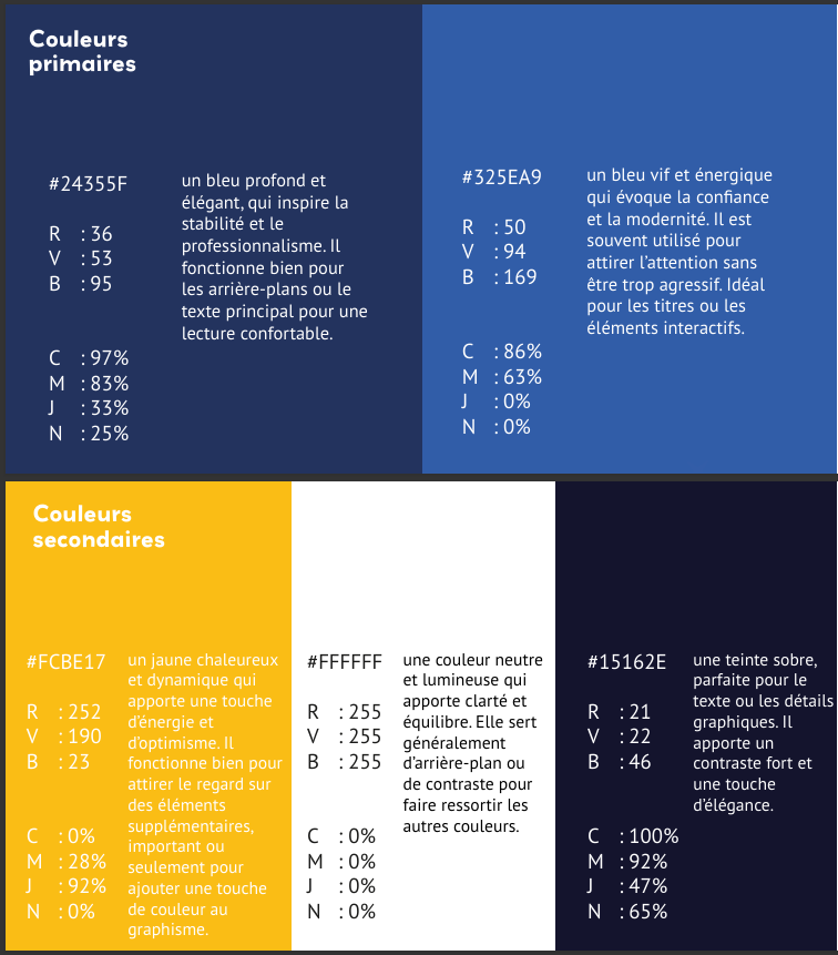Le logotype, la palette de couleurs, les typographies et les règles d’usage ont été conçus pour offrir une identité moderne, cohérente et déclinable sur différents supports (print, web, cartes de visite, présentations...).