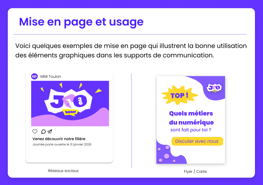 Ce projet consistait à concevoir la charte graphique officielle de la Journée Portes Ouvertes MMI 2026. L’objectif était de proposer une identité visuelle moderne, dynamique et accessible, destinée à promouvoir l’événement auprès des futurs étudiants. Le projet inclut la création du logo, la définition des couleurs principales et secondaires, les règles d’utilisation du logo, ainsi que la mise en page de supports de communication tels que publications web et flyers. Ce travail mʼa permis de développer mes compétences en direction artistique, en design graphique et en conception d’identités visuelles complètes.